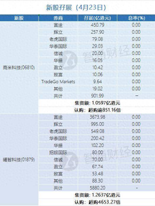智通财经APP获悉,商米科技(06810)、曦智科技(01879)、迈威生物(02493)正在招股中。截至4月23日,富途证券、辉立证券等券商为商米科技借出901.99亿港元,超购逾851.16倍;为曦智科技借出5880.2亿港元,超购逾4653.27倍;为迈威生物借出432.5亿港元低息配资开户,超购逾298.8倍。